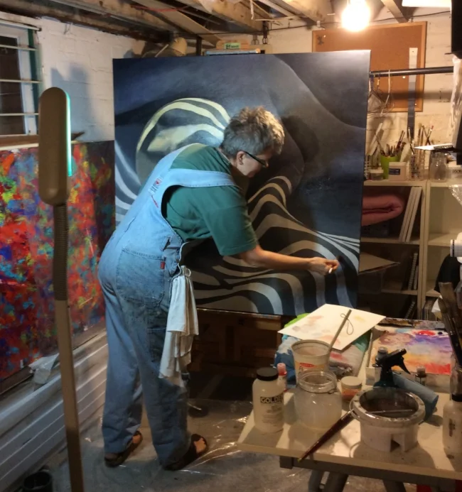 OK, this may look familiar to you. Encouraged by the reaction to the painting I posted on Day 277, I decided to try something I have been contemplating for a while: a really big pear painting. So, yes, this is the same image, but it's more than twice the size. At 48 X 48", it's THE biggest painting I have EVER done. Here is a picture of me working on it, to get an idea of the scale: