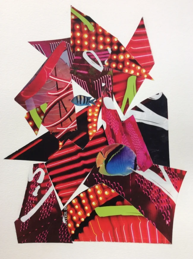 As you may recall, each time I get the free CAA Magazine in the mail, I make a collage from it. This one is an odd combination of Las Vegas neon signs and tropical fish.