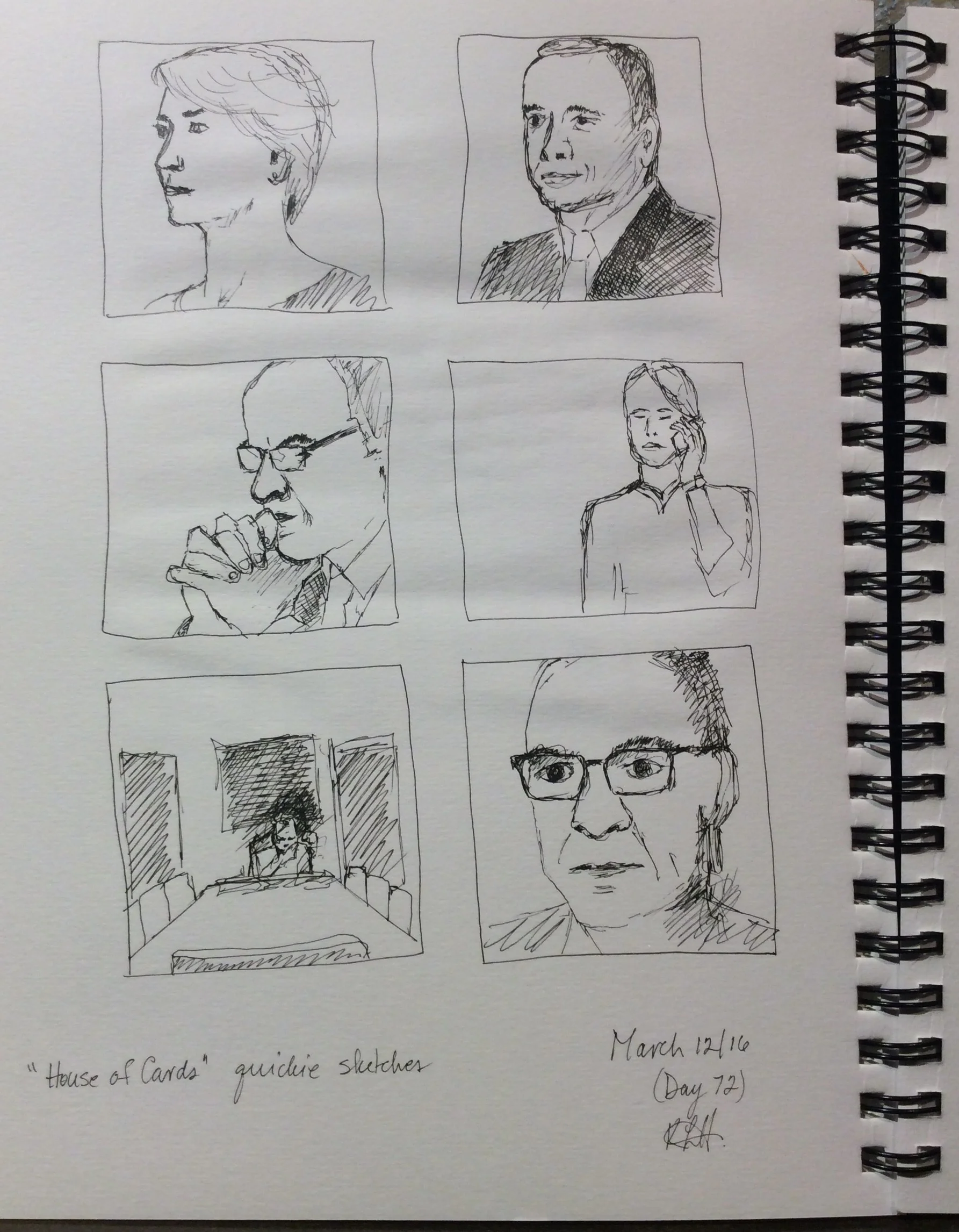 "House of Cards quickie sketches" Art journal, ink