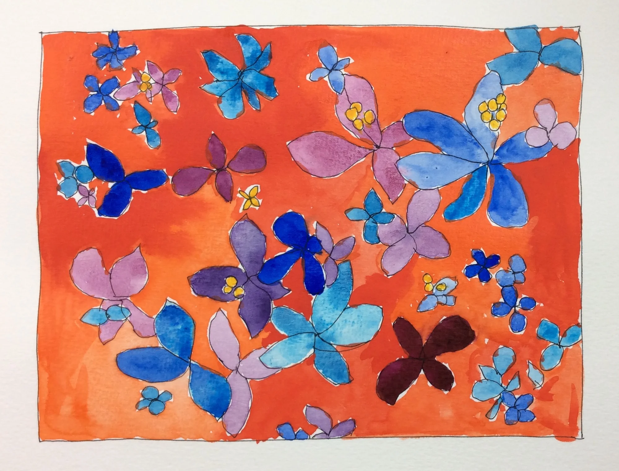 I am working on another forest floor painting (like this one and this one). My daughter Stacey suggested it might be interesting to try something other than the "natural" colours, so I did a quick sketch in my art journal to give that idea a try. Might be interesting....