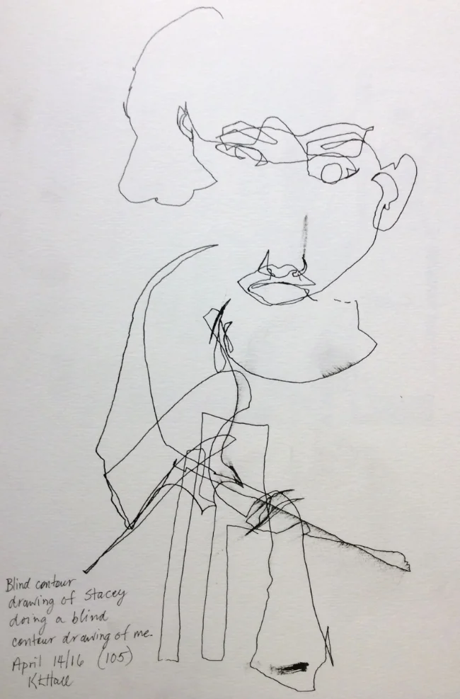 Day 105 April 14, 2016 View fullsize "Blind contour drawing of Stacey doing a blind contour drawing of me" Art journal, ink.