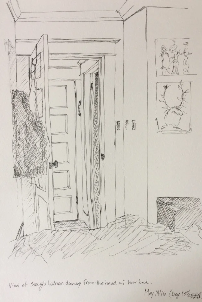 "View of Stacey's bedroom doorway from the head of her bed" Art journal, ink
