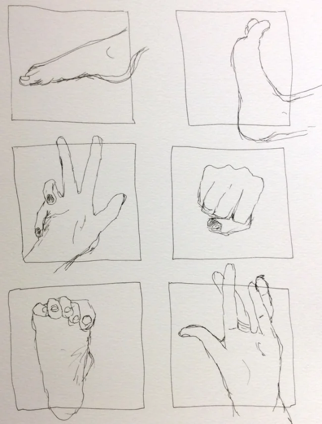 Day 137 May 16, 2016 View fullsize "One-minute (and a bit) sketches of Stacey's hands and feet" Art journal, ink.
