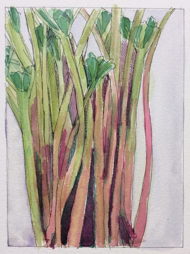 My mother was so excited about getting the first rhubarb of the year at the farmers' market, she emailed a picture of it to the family. So I did this little sketch of it.