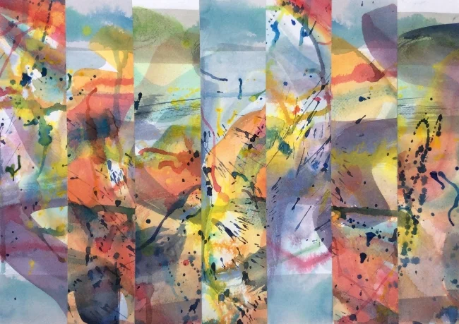 I decided to try a watercolour "doodle" on a larger scale (full sheet of watercolour paper, 22x30") but I didn't like it. So I cut it up and reassembled it like this. I suppose it's a bit like fireworks -- appropriate for Victoria Day!