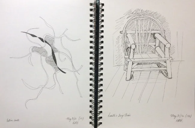 "Bedtime Doodle" and "Lucille's Twig Chair" Art journal, ink