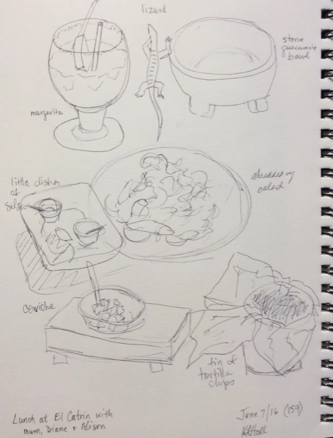 Day 159 June 07, 2016 View fullsize Art journal, ballpoint pen Did some quick sketches of the nice lunch out at El Catrin today with my mum and sisters.
