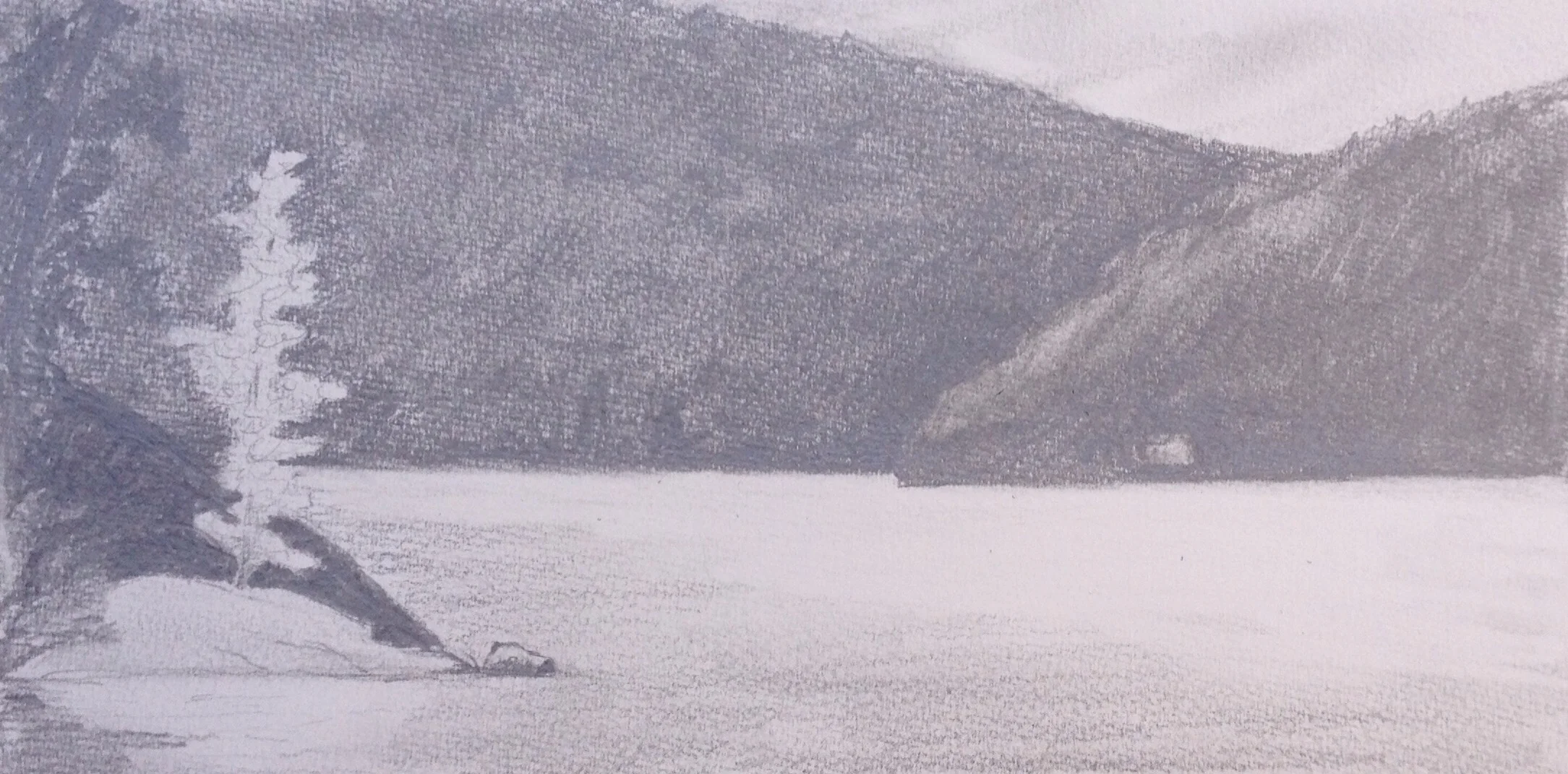 "View from the Dock on a Calm Morning, Grand Lake". Art journal, pencil