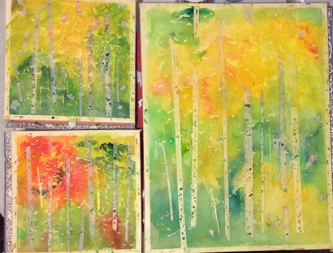 I'm exhausted after the Beach Studio Tour this weekend and not enough sleep last night (thanks to wildlife outside my bedroom window -- raccoons and a skunk!). But I managed to add some "resist" to these pieces before falling into bed. (The white stuff is masking fluid -- actually liquid latex -- that dries clear and "resists" subsequent layers of paint, then all gets peeled off later.)