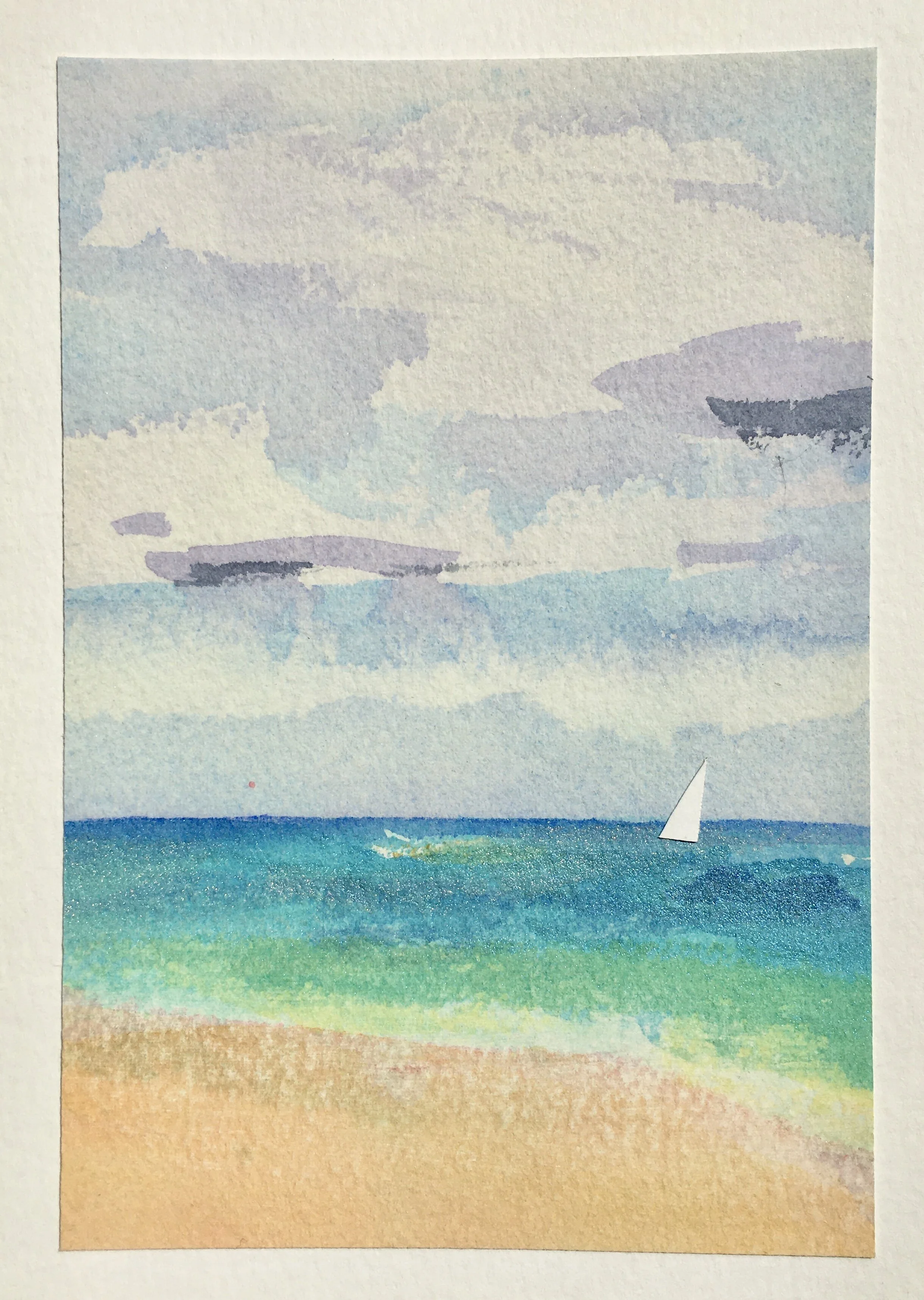 Today I cut a piece out of an old watercolour to make a notecard, and added a wee triangle for a sail. The painting was from my early efforts about 20 years ago, when we were living in Bermuda. This made me wonder whether the pandemic has reached that idyllic place. Of course, it has.